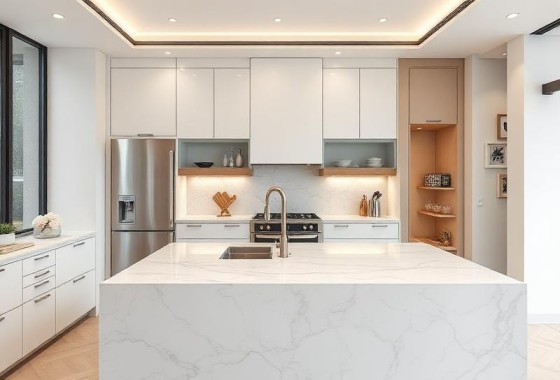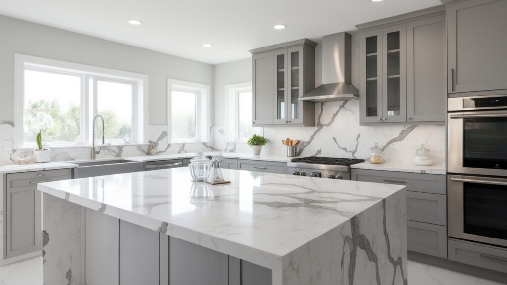Engineered quartz is widely used for countertops, flooring, and wall cladding due to its durability and low maintenance. Popular in kitchens and bathrooms across the US and Europe.